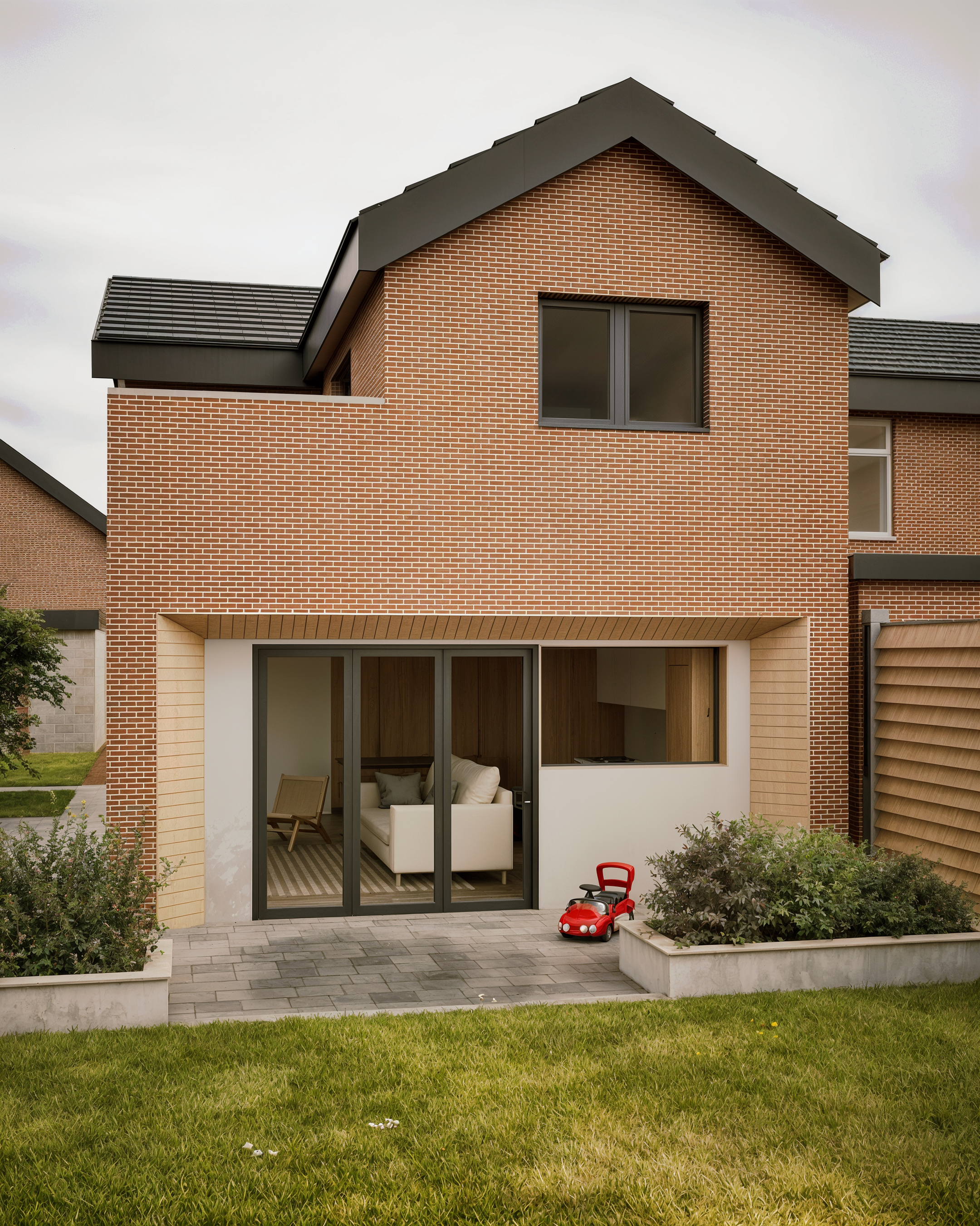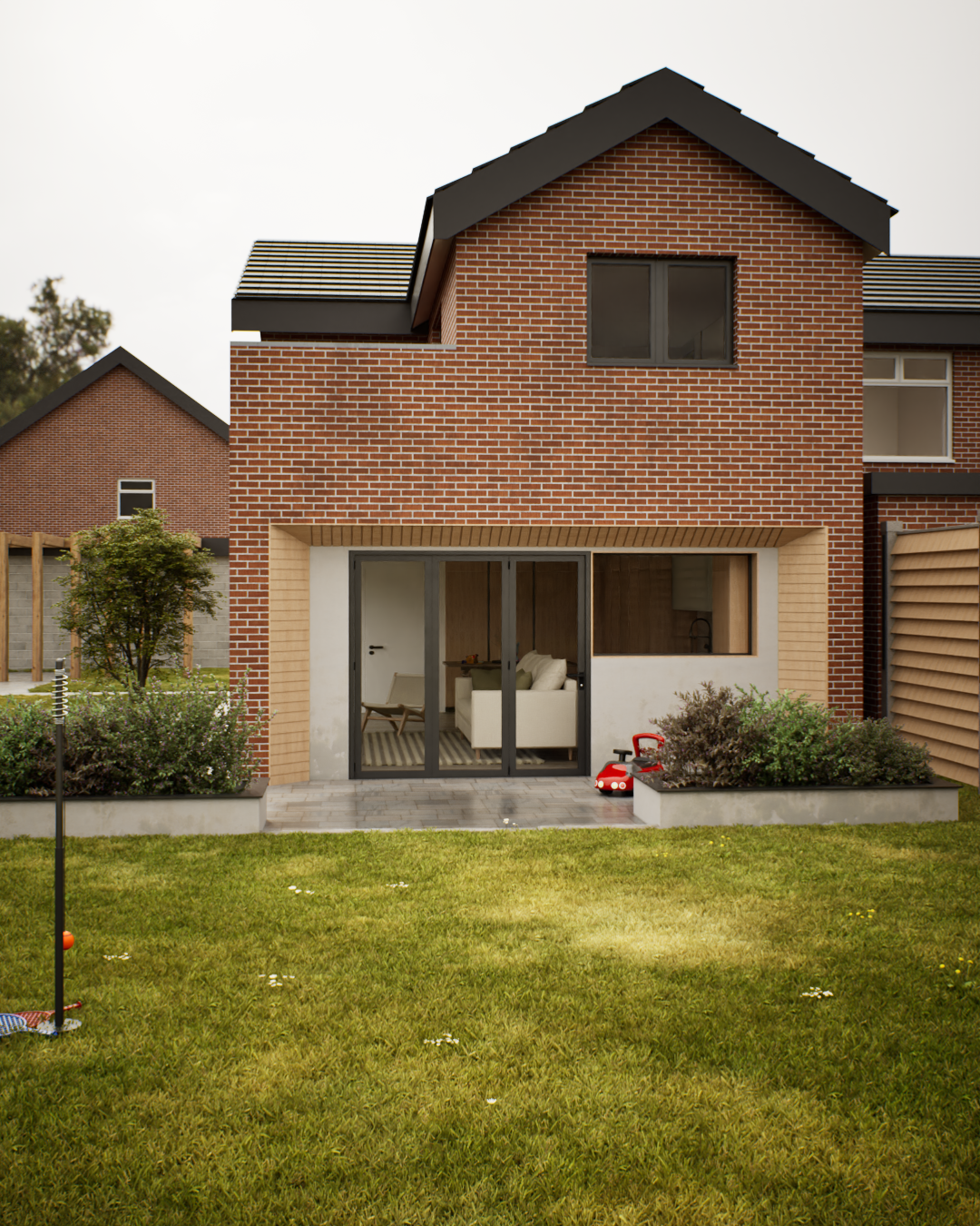 This project involved the design of a contemporary rear extension to an existing dwelling in Flintshire. The scheme creates a generous open-plan living, dining, and kitchen space with a strong connection to the garden, achieved through large-format glazing and carefully framed views. A restrained palette of brick, timber cladding, and dark metal detailing was used to complement the existing house while clearly expressing the new intervention.