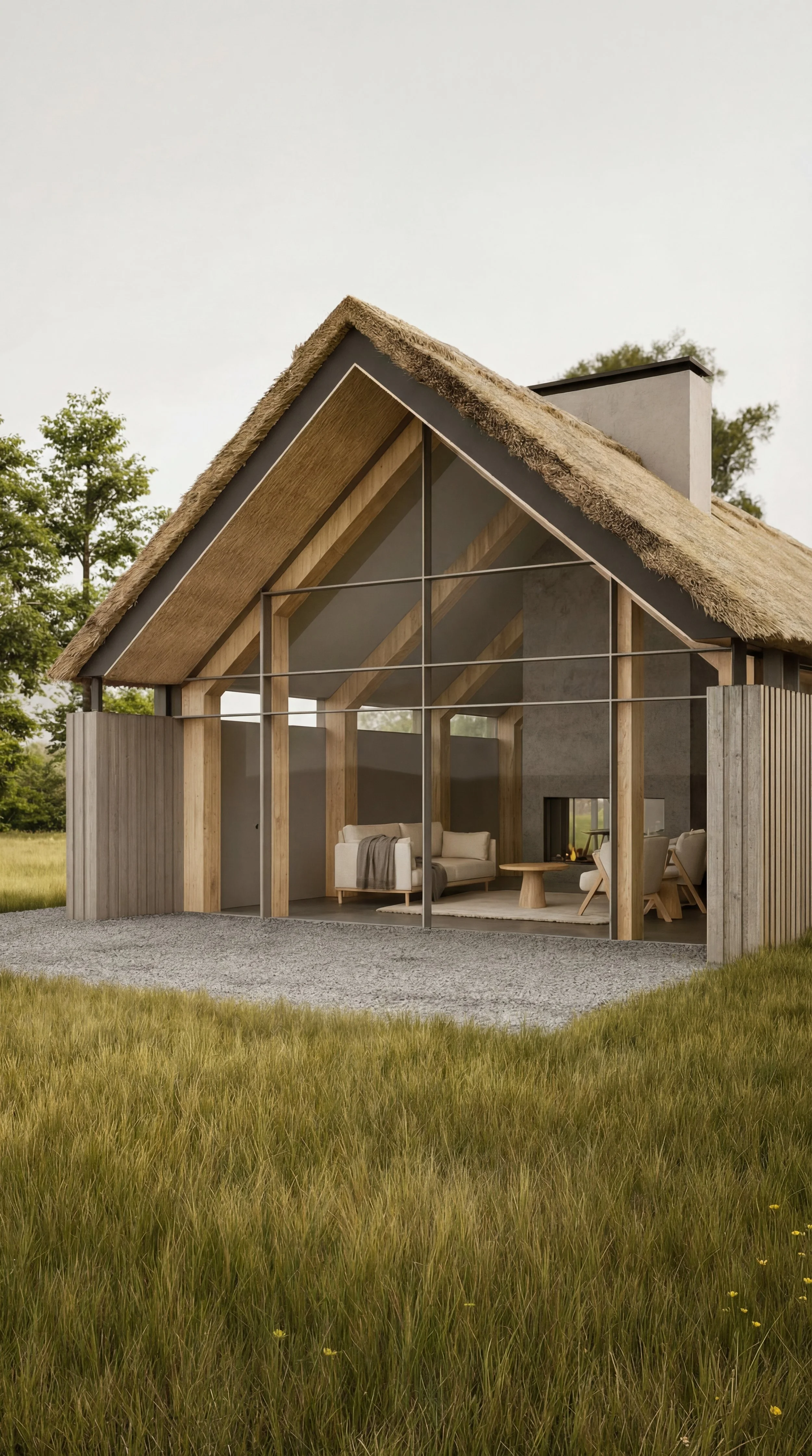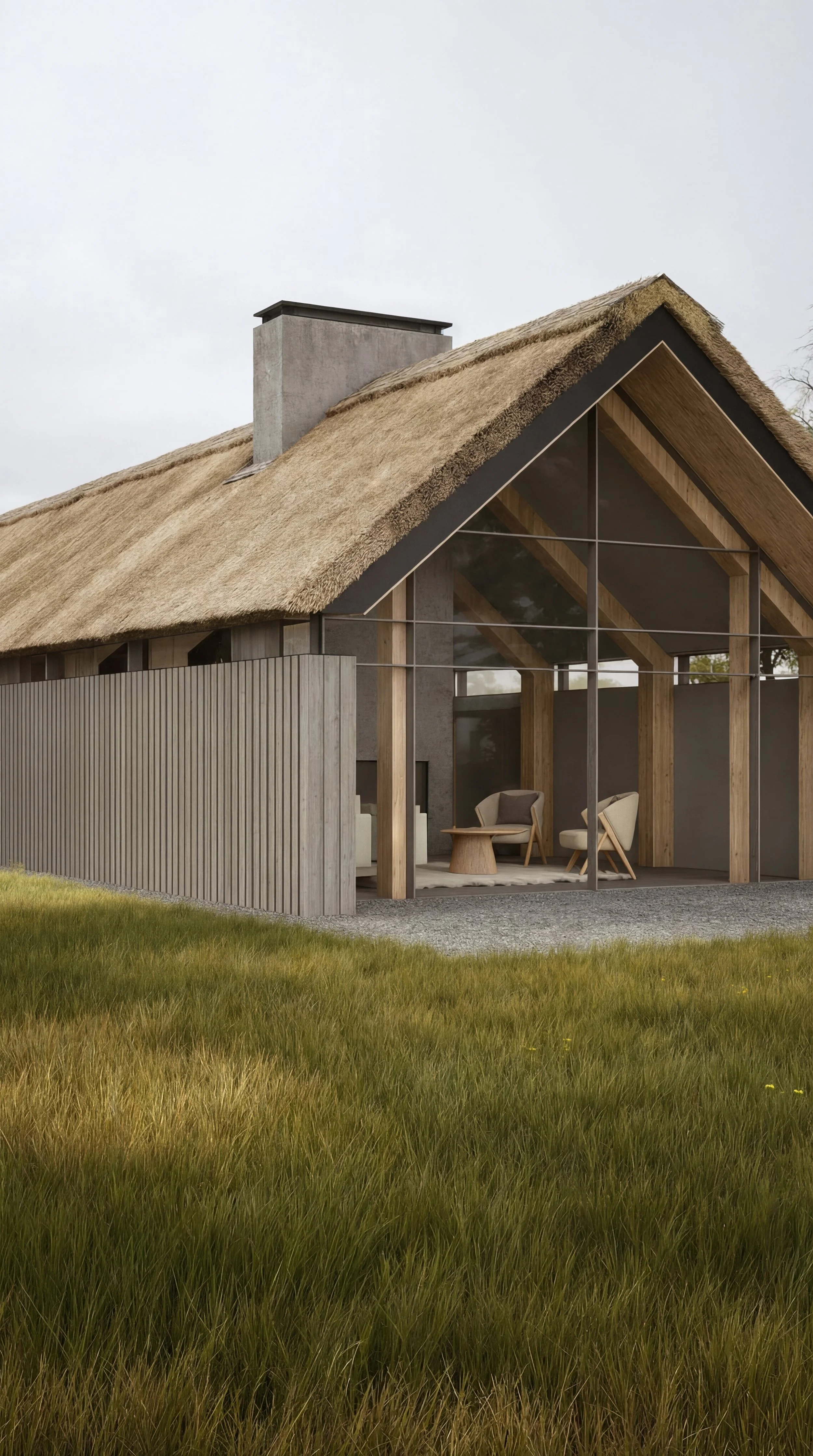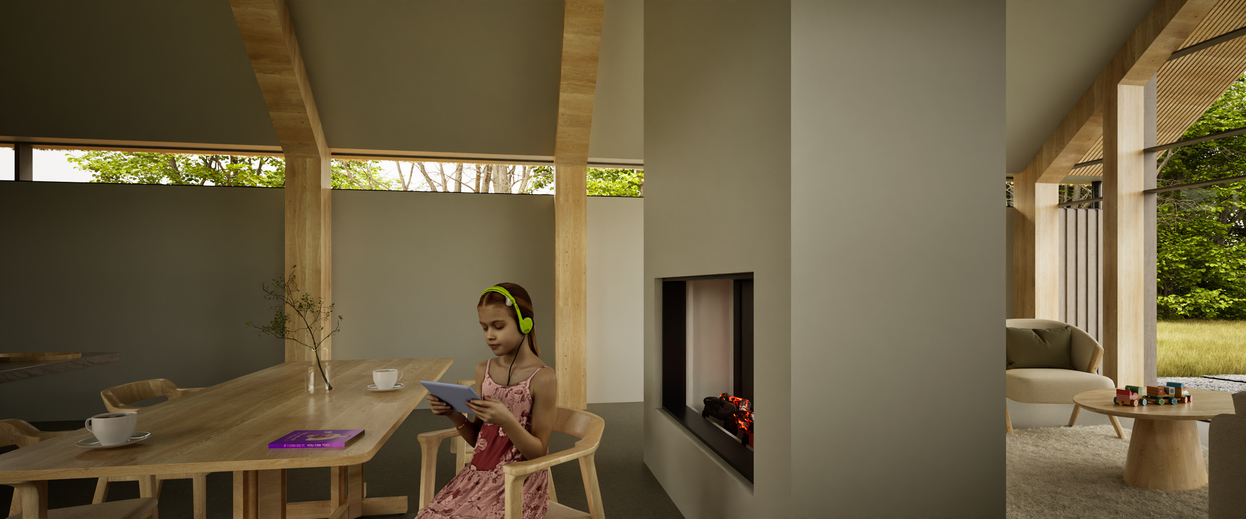 This project proposes a contemporary single-storey bungalow designed to sit quietly within its rural Pendle setting. The form is informed by traditional pitched-roof typologies, reinterpreted through a simple modern structure and a restrained material palette. Generous glazing and covered external areas strengthen the relationship between internal living spaces and the surrounding landscape, creating a calm and light-filled home tailored to modern living.